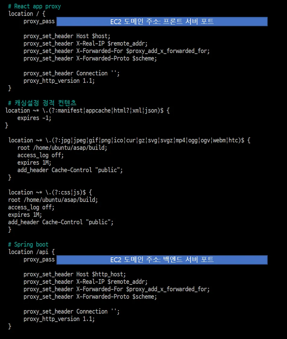 위처럼 nginx.conf에서 캐싱설정이나 (동적 캐싱은 redis를 사용하기 때문에 따로 안했다) proxy 설정을 쉽게 할 수 있고 Let’s Encrypt를 사용하면 무료로 SSL을 발급시켜주고 인증서를 자동으로 등록시키고 발급해준다. 90일이라는 유효기간이 있지만 이 또한 갱신이 쉬워서 많이들 사용한다.