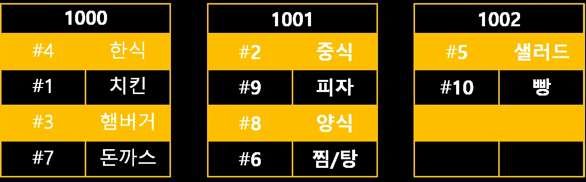 위 테이블은 인덱스가 적용이 안된 한국인이 자주 시켜먹는 배달 순위를 나타낸 Table이다.