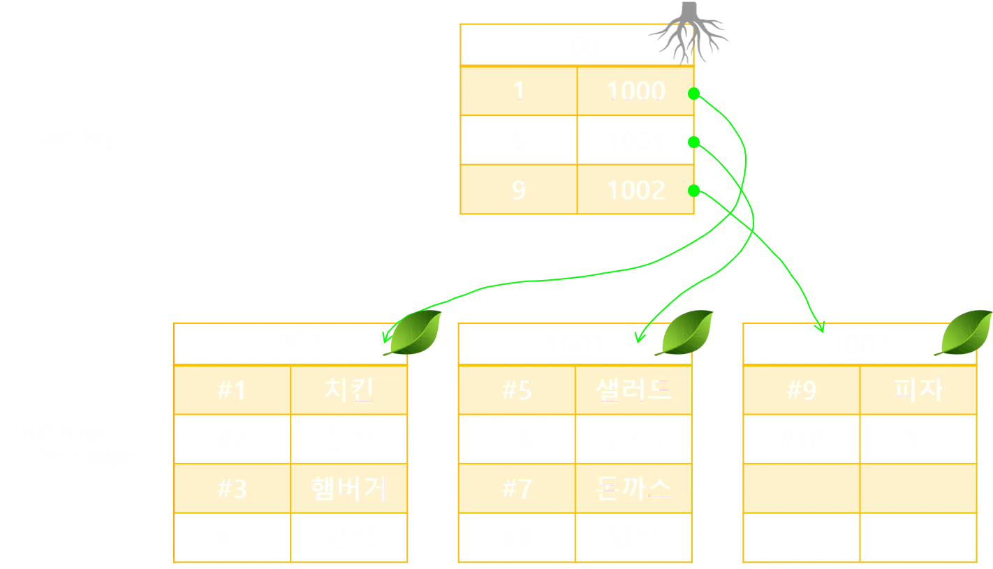 루트페이지가 Key값으로 PK를 가지고 있고 다른페이지의 번호를 포인터로 지니고 있다. 이러한 구조는 검색 속도를 빠르게 하지만, 생성, 업데이트, 삭제 부분에서는 새로 정렬을 해야하므로 느릴 수 밖에 없다.