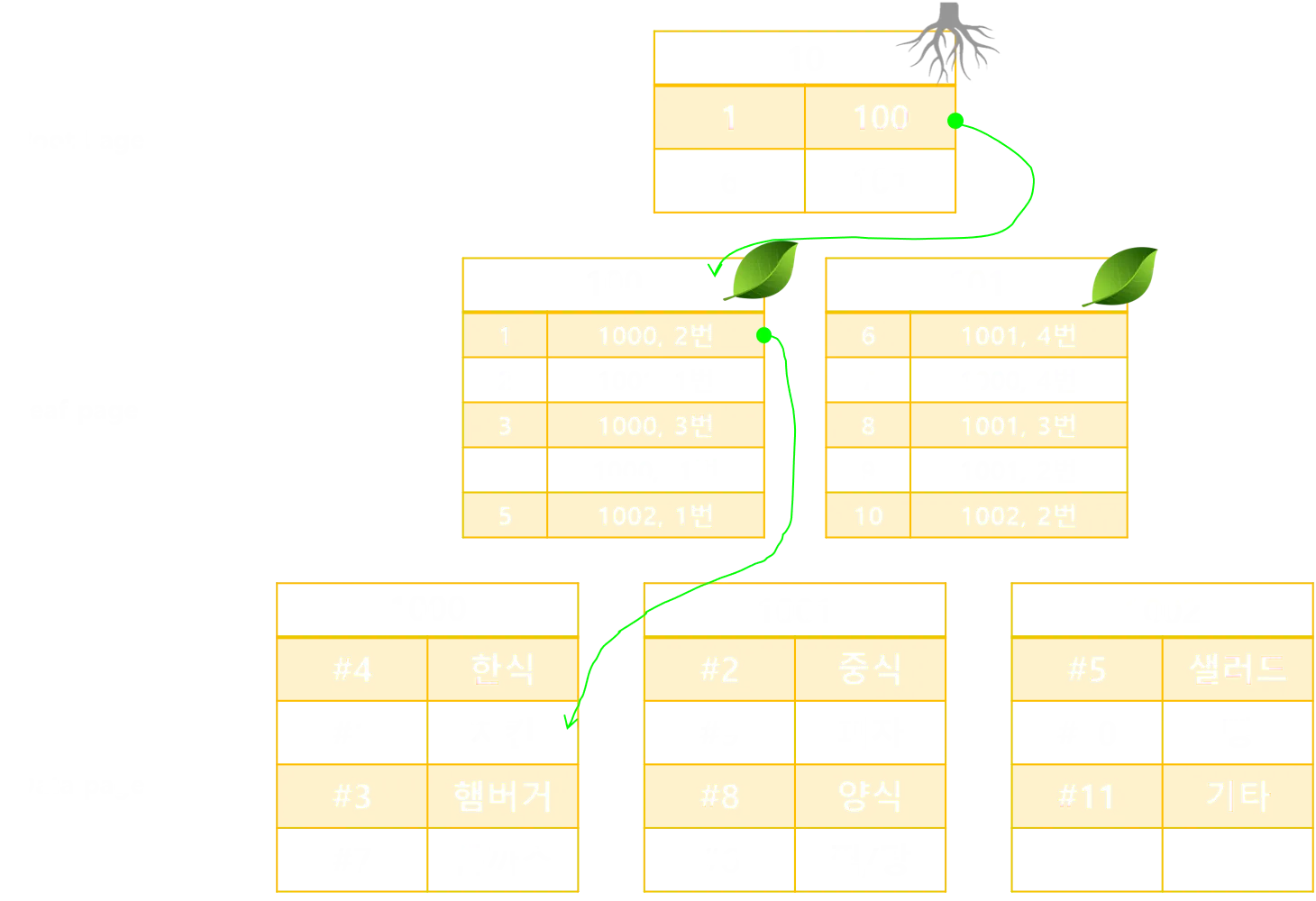 위그림을 보면 리프페이지에서 직접적으로 데이터를 가지고 있는 것이 아닌 데이터 페이지 번호와 해당 행의 위치를 저장하고 있다. 인덱스 페이지(Root + Leaf)는 정렬되어있으나 DATA page는 처음에 저장했던 순서 그대로이다.