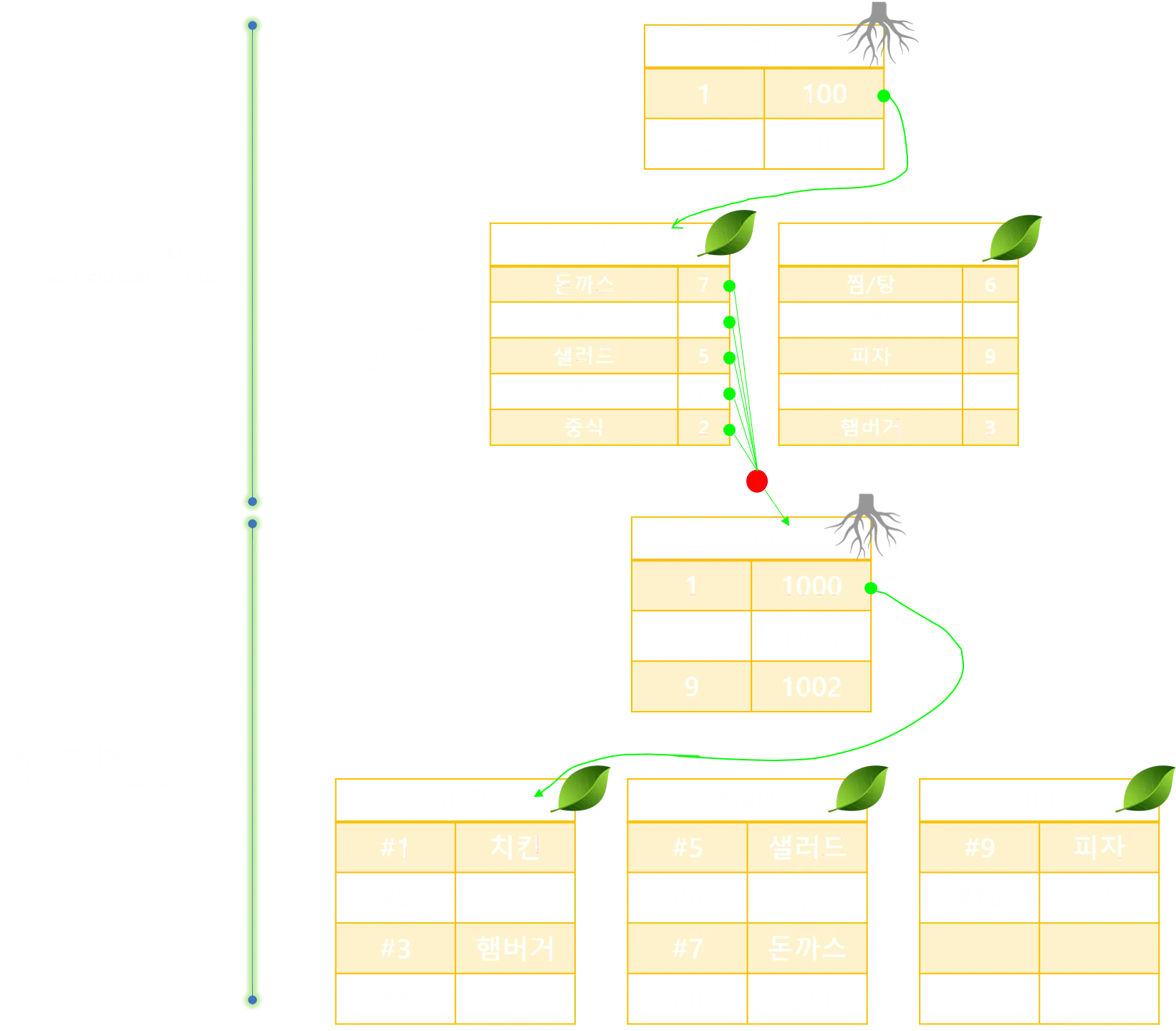 보통 인덱스 처리를 할때, 위와같이 혼합해서 사용하는 경우가 많다. PK는 기본적으로 존재해야 테이블을 생성할 수 있고, 추가로 조회가 자주 발생하는 부분에 대해 인덱스를 처리하기 떄문이다. 이럴경우 위와같은 구조로 작동한다. 순위에대해 PK를 지정하고 음식에 대해 클러스터형 인덱스를 설정한 모습이다.