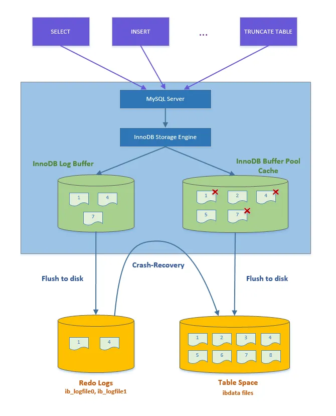 Redo Log는 장애시 Buffer Pool에 저장되어 있던 데이터의 유실을 방지, 데이터를 복구 하기 위해 사용된다.