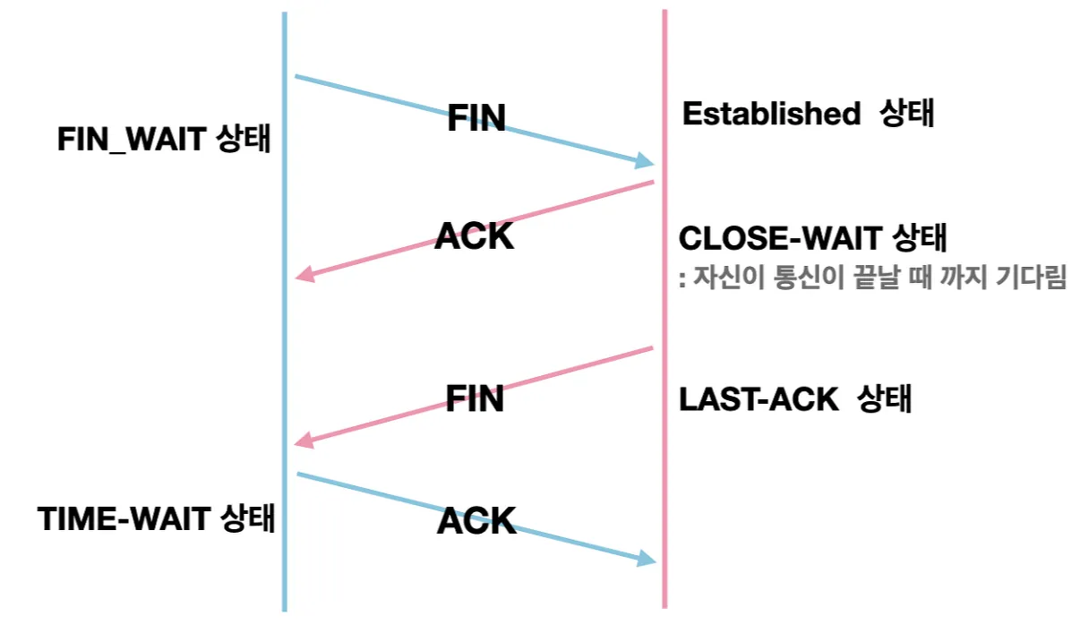 이러한 HTTP 요청과 응답 과정이 끝나면 연결을 종료해야 하는데 앞서 말한 4 handshaking 가 사용된다. 추가적으로 모든 과정이 끝나도 도착하지 못한 패킷이 있을 수도 있어서 일정 시간 소캣을 열어놓는다. 그런 잉여 패킷을 기다리는 상태를 TIME_WAIT이라 한다.